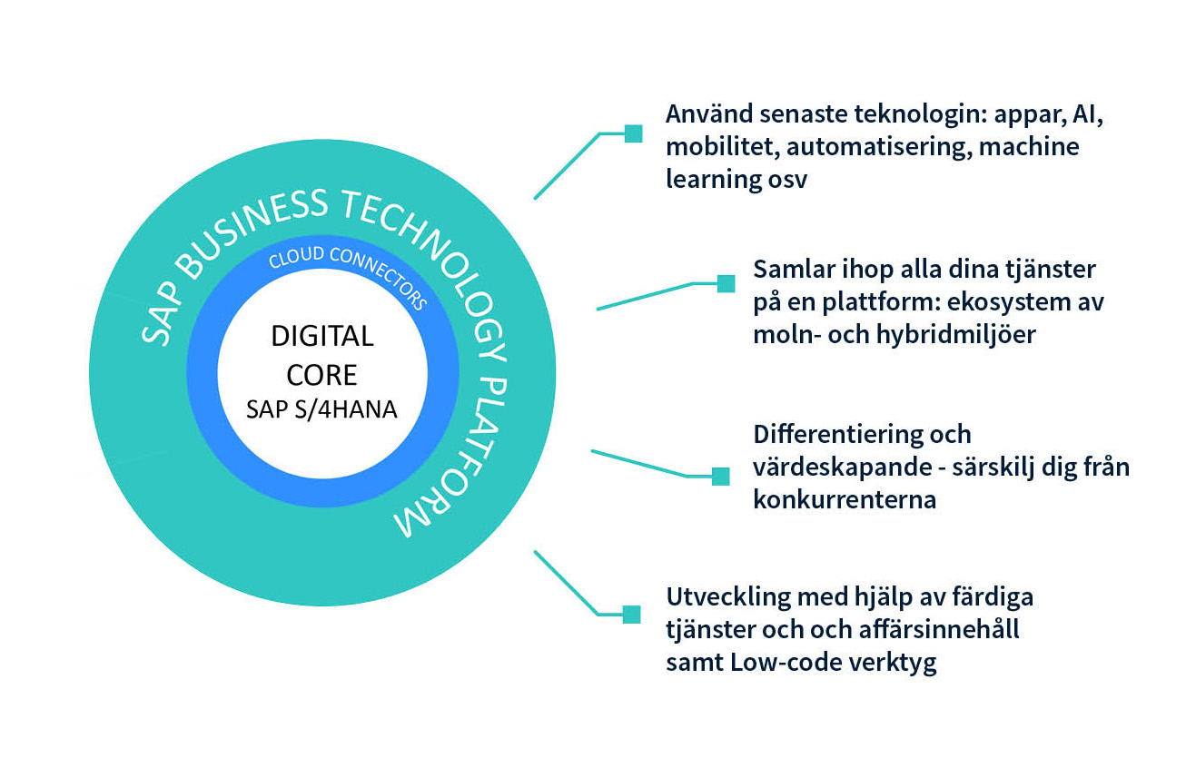 En utmaning för alla företag är att den tekniska utvecklingen sker snabbt och förväntas fortsatt accelerera. Kraven på innovation och flexibilitet ökar och möjligheten att kunna särskilja sig från konkurrenterna är en framgångsfaktor. Men hur differentierar vi oss? Hur utvecklar vi innovativa lösningar och tjänster? Hur blir vi mer effektiva? Kärnsystemen blir mer och mer standardiserade och det som är unikt för varje företag skapas i innovationsplattformar som SAP Business Technology Platform (BTP).