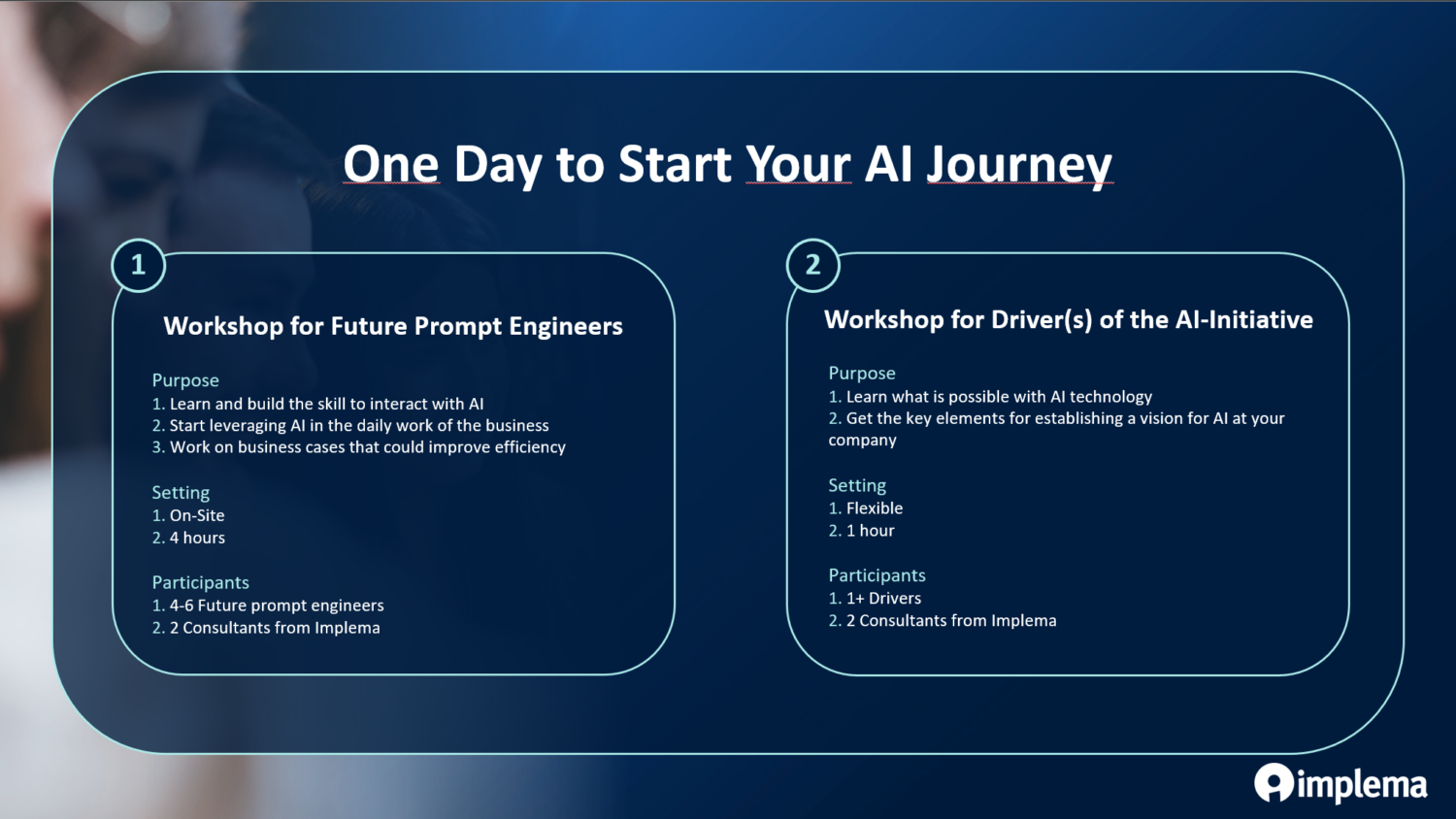 På Implema har vi fångat upp den ”förvirring” många känner. Det finns en mängd olika sätt att komma vidare. Att förstå vad just er verksamhet behöver och hur ni kan dra störst nytta av AI. Många tycker att en explorativ, skräddarsydd workshop är det bästa sättet. Här hjälper vi gärna till. Vi pratar gärna vidare med dig om dina och ditt företags AI-utmaningar.
