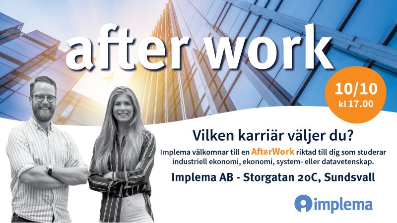 På kvällen samma dag bjuder Implema in till en AfterWork riktad till dig som studerar industriell ekonomi, ekonomi, system- eller datavetenskap.
